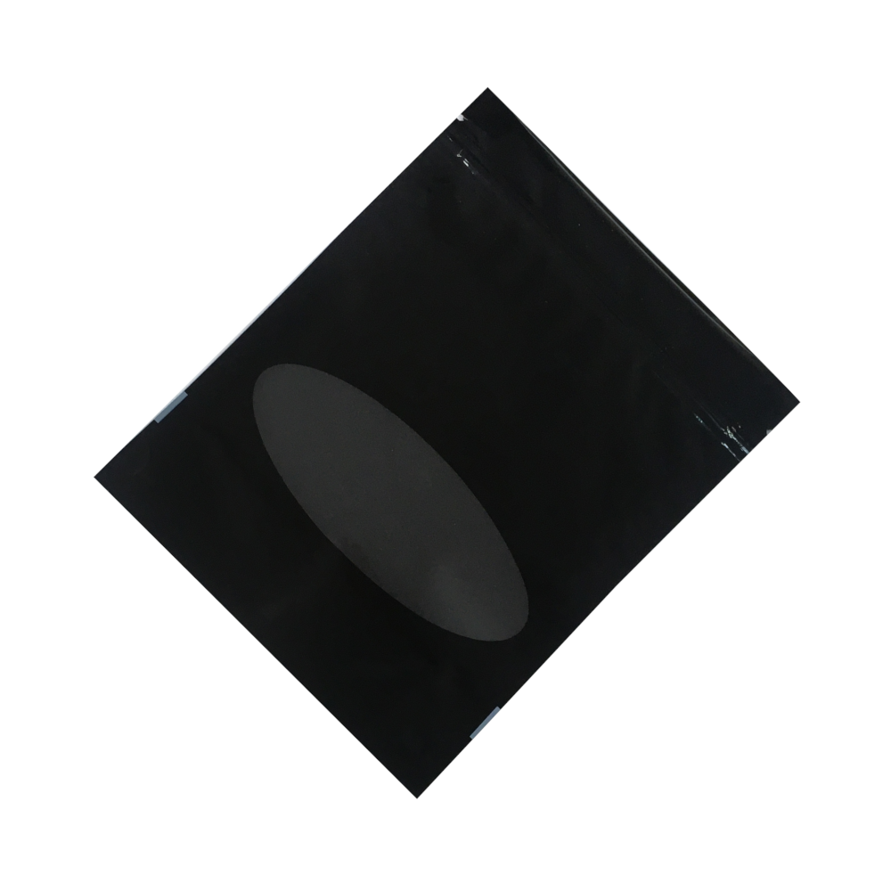 Размер 160×210+(40+40) мм. Высота до замка 180 мм. Плёнка (ПЭТ/ПЭ) плотность 93 мкм. Цвет чёрный глянцевый. Овальное прозрачное окно. Замок zip-lock.