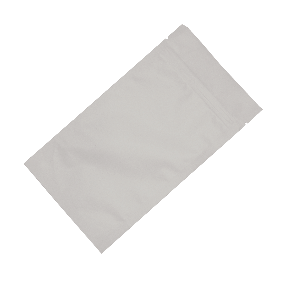 Размер 105×190×35 мм. Пленка фольгированная (ПЭТ/Al/ПЭ) плотность 110 мкм. Трёхшовный. Цвет белый матовый. Замок zip-lock.