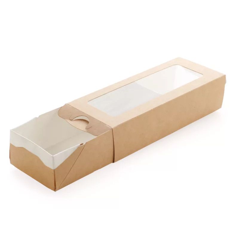 Идеальное обрамление для ваших нежных макаронс! Эта коробка-пенал из крафта с прозрачным окном-слайдером выгодно демонстрирует пирожные в ряд. Прочный картон защищает их от повреждений. Элегантное и стильное решение для кондитерских и домашних пекарей.