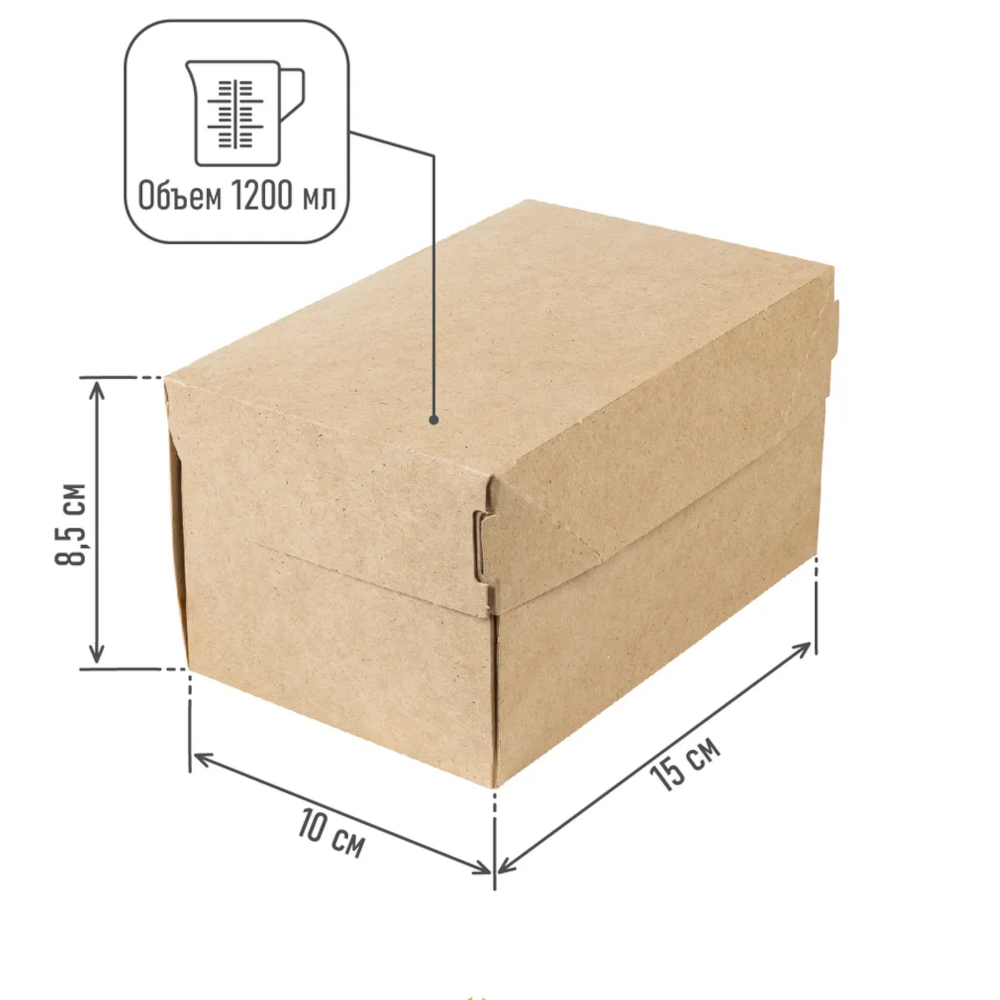 Размер 150×100×85 мм (1200 мл). Изготовлена из картона. Для пищевых продуктов.