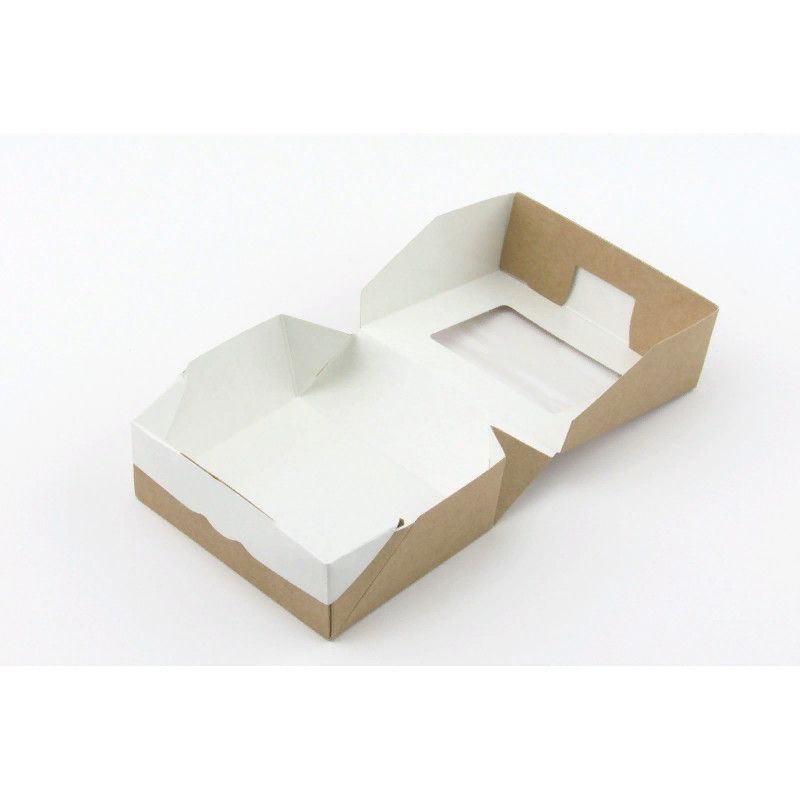 Размер 105×80×40 мм (240 мл). Изготовлена из картона с прозрачным окном в крышке. Удерживает воду. Полностью ламинирован изнутри. Пригоден для разогрева в микроволновой печи. Полностью биоразлагаемый.