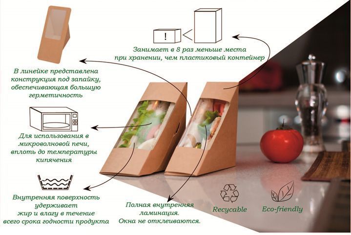 Размер 130×130×50 мм. Изготовлена из картона с прозрачным окном. Полностью ламинирован изнутри. Пригодна для разогрева в микроволновой печи. Не требуает сборки. Полностью биоразлагаемая.
