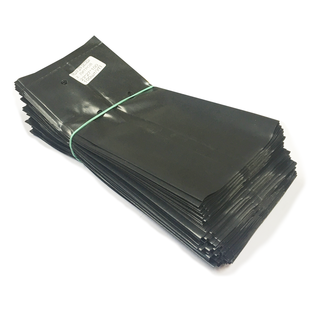 Объём земли 2 л (12×11×20 см). Материал — чёрная плёнка ПВД, плотность 100 мкм. 100 шт. в пачке.