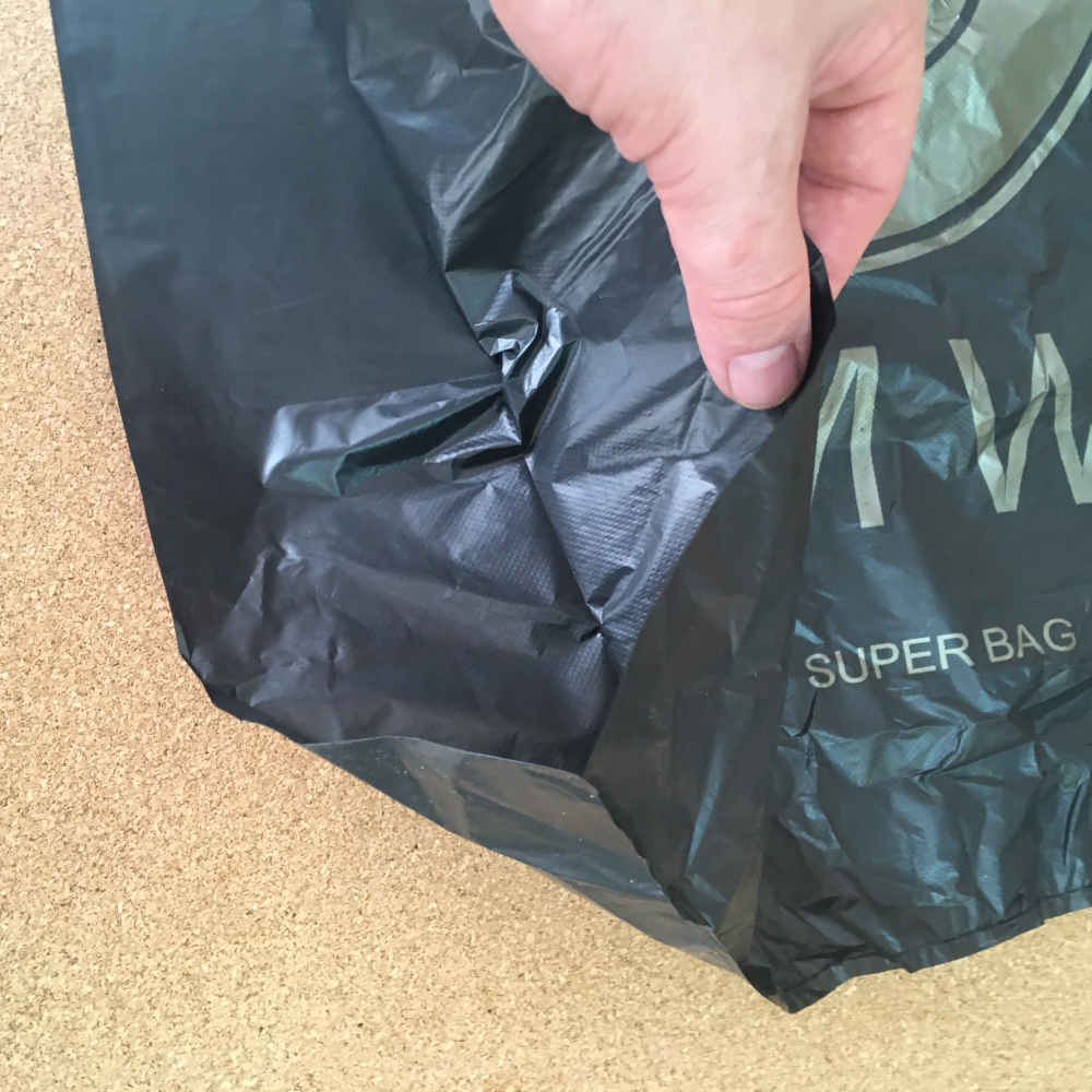 Очень прочный и объёмный пакет. Удобен и под вторичное использование, как мусорный мешок. Например в него помещается 20 пустых винных бутылок — мы проверили