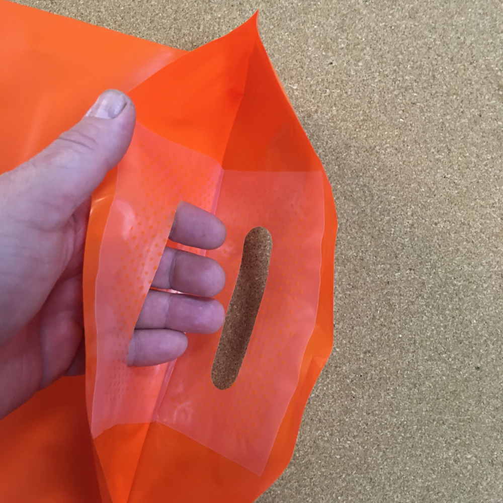Размер 300×400(+30) мм. Плотность 70 мкм. Цвет пленки оранжевый. Pantone 1665C. Усиленная вырубная ручка. Закладное дно.