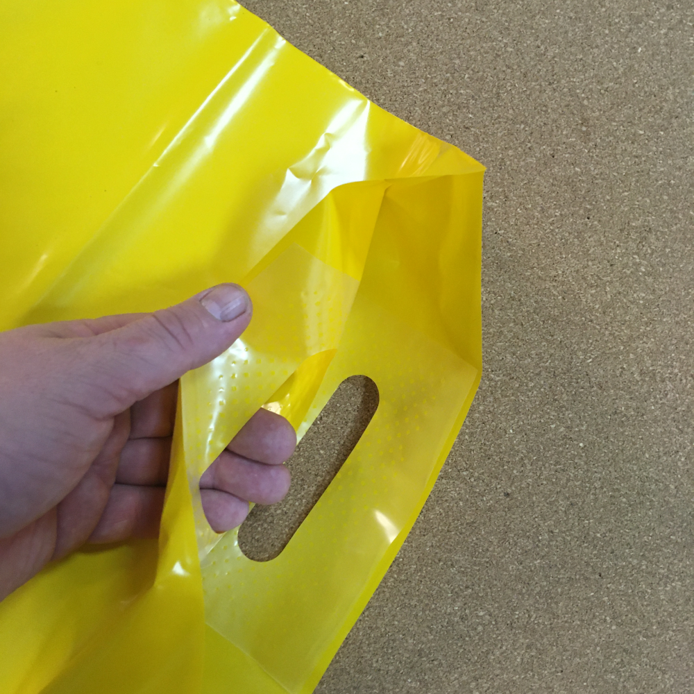 Размер 300×400(+30) мм. Плотность 70 мкм. Цвет пленки желтый. Pantone 1235C. Усиленная вырубная ручка. Закладное дно.