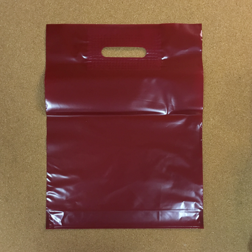 Размер 300×400(+30) мм. Плотность 70 мкм. Цвет пленки бордовый. Усиленная вырубная ручка. Закладное дно.