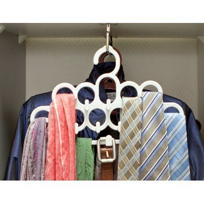 Вешалка имеет 7 колец с крючками для хранения галстуков, 4 кольца по бокам вешалки для платков и шарфов и нижнюю перекладину для 6 ремней средней ширины.